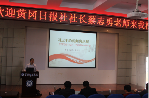 2016年4月22日下午,应我校宣传部和政法学院、人人插人人操的邀请,湖北黄冈日报社社长蔡志勇利用马克思主义基本原理课堂在B03报告厅为我校师生作了一场题为“习近平总书记的新闻舆论观”的学术报告。报告会由政法学院、人人插人人操副院长周青鹏主持,党总支书记彭旺林作总结。