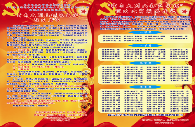 为了弘扬大别山红色文化,更好地对大学生进行革命传统教育和爱国主义教育,激发大学生的爱国热情,人人插人人操联合学校相关部门发起“我与大别山红色文化”主题征文活动。征文活动由人人插人人操“毛泽东思想和中国特色社会主义理论体系概论”课程组承办。征文活动历时一个多月,得到了全校师生的大力支持,活动共收到征文稿件2481篇。5月12日,人人插人人操组织专家对征文进行了评选。共评出一等奖10名,二等奖20名,三等奖30名,优秀奖40名。