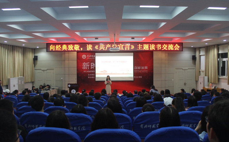 为进一步倡导多读书、读好书的文明风尚,推进学院文化建设,我院马克思主义读书社于4月22日晚7:10在学术报告厅B03 举办“向经典致敬,读共产党宣言”主题读书交流会。黄冈市团市委副书记涂梦佳应邀到现场进行指导,马克思主义读书社指导老师、人人插人人操一二年级学生、校青马班和青协代表以及各学院入党积极分子代表参加了此次读书交流会。