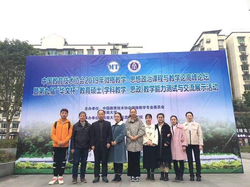 2019年11月29日至12月2日,由中国教育技术协会、西南大学主办,西南大学人人插人人操承办的2019年微格教学▪思想政治课程与教学论高峰论坛暨第九届“华文杯”教育硕士(学科教学▪思政)教学能力测试与交流展示活动成功举办。在潘松文和黄树光两位教授的带领下,我院硕士研究生王亚琪、王文婧、向菁菁和杨月参加了比赛,孙灿灿、张锋和余志烈三名同学参会观摩。