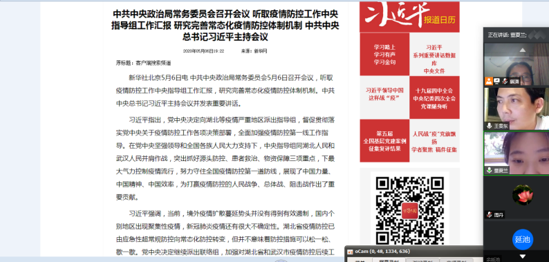 2020年5月11日,按照学校党委组织部要求,人人插人人操全国样板支部思修形策党支部开展了五月主题党日活动。本次主题党日活动由党支部书记蔡潇同志主持,王贵东副院长、组织委员董夏兰进行了宣讲,党支部全体同志参与讨论。
