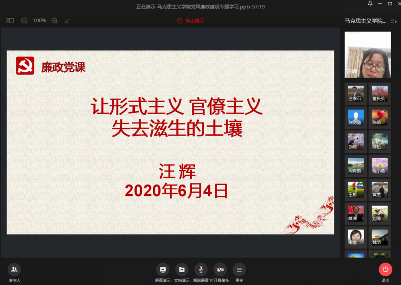 汪辉首先领学了中共中央办公厅发布《关于持续解决困扰基层的形式主义问题 为决胜全面建成小康社会提供坚强作风保证的通知》,要求持续解决形式主义突出问题,深化拓展基层减负工作,坚持标准不降、力度不减,为决胜全面建成小康社会、决战脱贫攻坚提供坚强作风保证。党课引用了大量的案例,结合高校实际,梳理高校教师可能面临的主要廉政风险,要求全员教职工警钟长鸣,严守纪律红线。党课还通过对照贯彻落实、履职尽责、服务师生、基层减负几个方面,列举出学校不同程度存在形式主义官僚主义的问题,并深刻剖析原因,提出解决方案。她强调,马院一定要高站位对待、高标准谋划、硬举措推进,必须将整治形式主义、官僚主义作为检验“两个维护”的“试金石”,切实扛牢政治责任;将整治形式主义、官僚主义作为松绑减负的“突破口”,聚焦解决突出问题;将整治形式主义、官僚主义作为引领实干的“助推器”,标本兼治抓常抓长。领导和上级要身体力行、以上率下,真正把求真务实、真抓实干的风气树起来,把力戒空谈、崇尚实干的导向立起来,为敢于担当、苦干实干者鼓劲撑腰,不断深化巩固整治成果,健全完善长效机制,更好地激励广大干部担当作为。