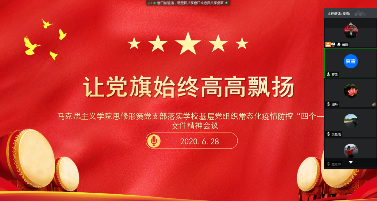 2020年6月28日下午,按照学校下发的《黄冈师范学院基层党组织常态化疫情防控“四个一”行动方案》要求,人人插人人操思修形策党支部进行了一场精彩的学习交流会,党支部同志们共同学习了文件精神,听取了微党课,进行了组织生活会并都发表了自己的看法和观点,进一步提高了思想认识,规划了2020年下半年工作。