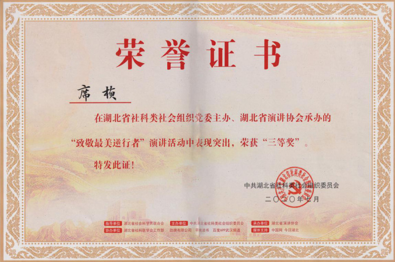 自5月底湖北省社科联发布举办“致敬最美逆行者”演讲活动通知以来,我校人人插人人操高度重视本次活动的意义和价值,汪辉书记和汪季石院长进行了多次的组织指导和试讲工作。在进行了一个多月的准备和选拔之后,席桢副书记和蔡潇博士作为人人插人人操代表参加了初赛。两位老师认真准备,反复练习,在我校2020年新近开放的智慧教室进行了多次演练,于6月19日进行了初赛视频录制并上交。7月10日,湖北省社科联选拔了12位同志作为决赛选手,人人插人人操蔡潇博士作为我校代表参加了决赛并获得二等奖。本次活动展示了湖北社科人在战疫情期间的英勇精神面貌,展现了新时代学人的“铁肩担道义”与“妙笔著文章”的使命担当,为进一步做好社科联各项工作奠定了良好的基础。 喻立平书记亲自为获奖选手颁奖并热情发言,他说演讲的舞台很小,但是窗外的世界很大,我们社科人要进一步弘扬党的优良作风,充分发挥抗疫中所体现出来的迎难而上、勇于担当的良好作风,以钉钉子精神狠抓工作落实,推动各项工作干在实处、走在前列,全力夺取疫情防控和经济社会发展双胜利,以优异的成绩向明年建党100周年献礼!