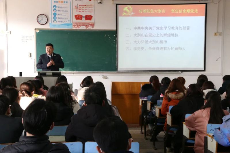王立兵从“中共中央关于党史学习教育的部署”“大别山在党史上的辉煌地位”“大力弘扬大别山精神”“学党史,争做奋进有为的黄师人”四个方面为同学们上了一堂形象生动、别开生面的思政课。他从开展党史学习教育的重大意义、主要目的、基本要求及学习重点等四个方面解读了中共中央关于党史学习教育的部署。从中国共产党的重要建党基地、创建了全国第二大革命根据地、走出了三大红军主力部队、三大事件拉开了解放战争到战略反攻再到全面胜利的序幕等四个方面阐述了在大别山在中国革命四次大转折中的重大贡献。王立兵将大别山精神概括为坚守初心、勇担使命、紧跟党走、不胜不休。他指出,“坚守初心”是大别山精神的核心要义;“勇担使命”是大别山精神的鲜明特征;“紧跟党走”是大别山精神的永恒主题;“不胜不休”是大别山精神的可贵品质。最后,他从坚持精挑细选、避免野史当家, 坚持实事求是、避免以偏概全,坚持论从史出、避免主观臆断,坚持静心研读、避免囫囵吞枣,坚持全身学习,避免浮光掠影五个方面勉励同学们认真学党史,争做奋进有为的黄师人。