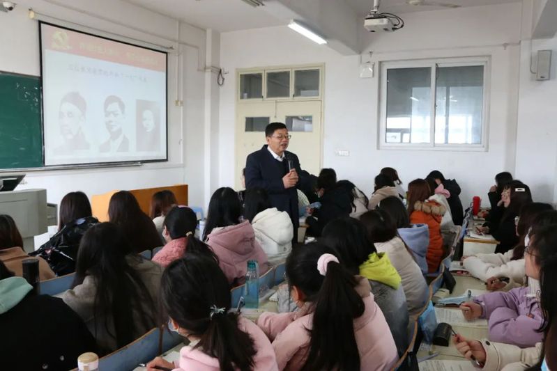 3月2日上午,校党委书记王立兵走进博学楼518教室,为人人插人人操思政2019级01-02班学生讲授了题为《传颂红色大别山 坚定信念跟党走---在学思践悟党史中成长成才》的开学第一堂思政课。