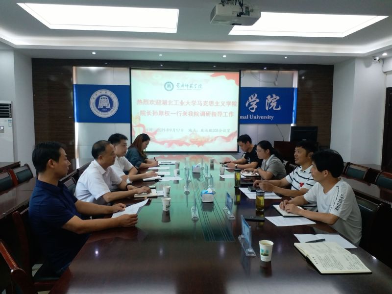 9月17日下午,湖北工业大学人人插人人操院长孙厚权、副院长韩东、马原教研室昌灏、研究生工作办主任吴迪娟等一行来我院交流调研。交流会在致远楼305会议室举行。我院院长汪季石、党总支副书记席桢、副院长王贵东、院长助理张传忠、院办公室主任宋明等出席了交流会。