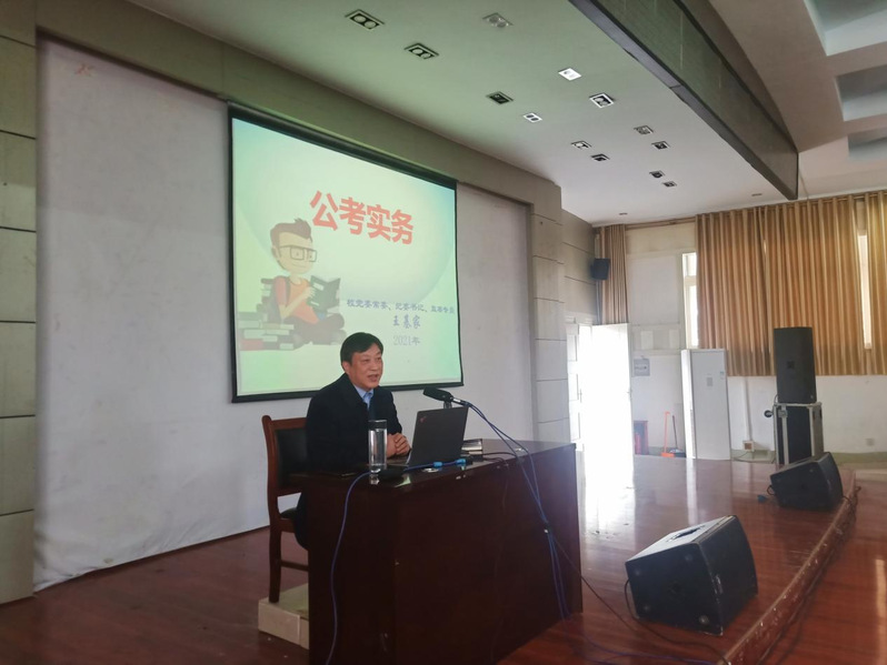 随后,王基家书记全方位介绍了公考定义、主要类型、公考时间、公务员考试笔试及面试等基本情况,细致分析了公务员考试中的各类题型。结合自身工作经历,王书记为同学们分享了许多面试技巧,并鼓励大家从做好职业规划、报考合适岗位、积极作好准备、强化刻意练习、保持良好心态五个方面,有针对性地进行备考,把握时代脉搏,锻炼自身能力。