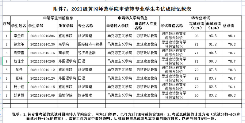 根据《2021级黄冈师范学院人人插人人操第二次转专业工作方案》要求,2022年6月23日下午对申请转入我院各专业的学生组织了笔试和面试,现将成绩公示如下: