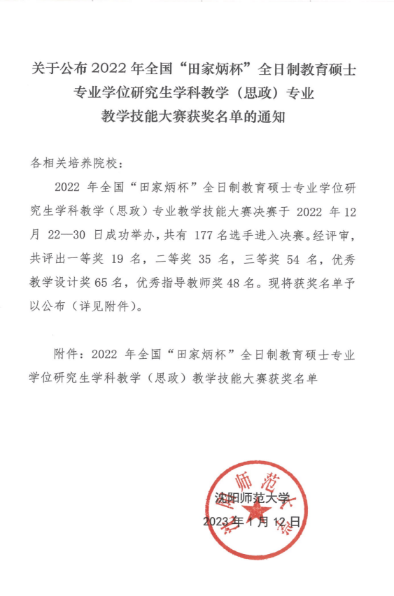 由全国教育硕士专业学位教学指导委员会指导,沈阳师范大学主办的全国“田家炳杯”全日制教育硕士学科教学(思政)专业教学技能大赛于2022年12月22日—24日举办。本次决赛采取线上方式进行,共有来自华东师范大学、陕西师范大学、华中师范大学等高校的177名同学参加。经评审专家评定,我院2021级学科思政研究生胡友和2020级学科思政研究生戢欣怡喜获一等奖。胡友同学的获奖作品《以人民为中心的发展思想》,指导老师为校党委副书记王基家;戢欣怡同学的获奖作品《市场调节》指导老师为李莉教授。王基家、李莉获大赛“优秀指导教师奖”。