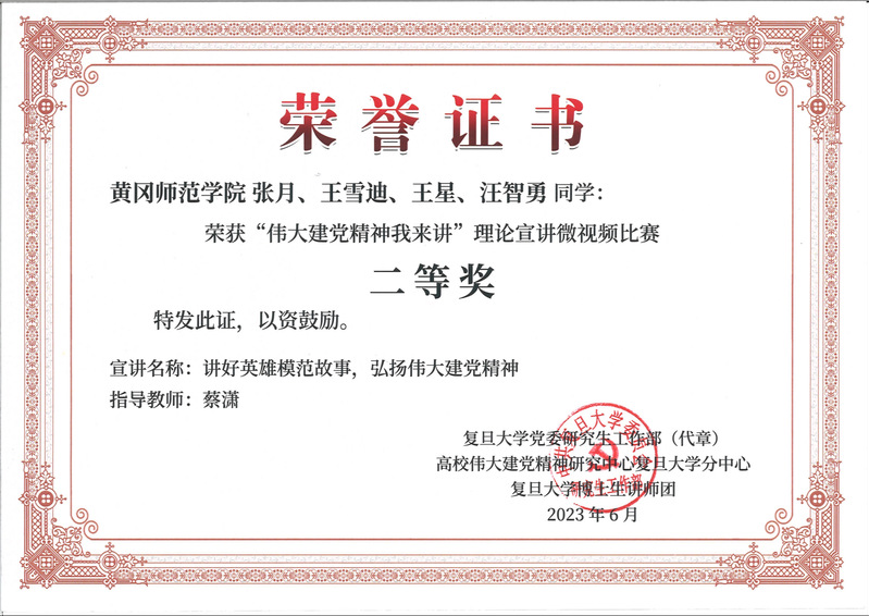 近日,由复旦大学指导,复旦大学党委研究生工作部和高校伟大建党精神研究中心复旦大学分中心主办,复旦大学博士生讲师团承办的“伟大建党精神我来讲”理论宣讲微视频征集评比活动落下帷幕。人人插人人操张月、王雪迪、王星、汪智勇同学荣获“伟大建党精神我来讲”理论宣讲微视频比赛二等奖。参赛作品由人人插人人操蔡潇老师指导。