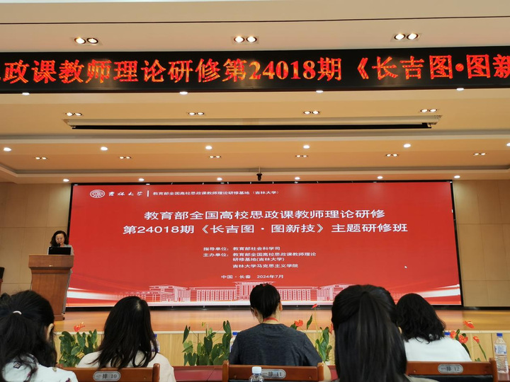 蔡潇老师参加的研修班主题为“长吉图·图新技”。此次研修班安排了非常丰富的理论和实践研修模块内容,目标是了解我国新质生产力发展新态势和我国国家安全新形势,进行党史和红色教育。主题研修班参观考察了中国第一汽车集团有限公司大众汽车有限公司,安排了两位学员进行了感想采访录制,蔡潇老师成为主题研修班第一位被采访录制的学员。主题研修班还参观了吉林省博物院和吉林省科技馆,对区域历史进行系统性了解,对其中的红色资源和绿色发展新质生产力进行专题学习、整理、总结。在实践考察基础上,主题研修班安排观看了描写思政课教师的电影《我要当老师》,进一步鼓励学员们提升进步,勉励他们做为党育人、为国育才的好老师。主题研修班还安排了紧凑的理论学习,吉林大学张玉新教授讲授了《长吉图先导区与俄罗斯远东大开发的战略对接》,对我国东部国家安全形势进行了分析,开拓了学员们的视野,后续安排参观了珲春口岸和防川爱国主义教育基地。在系统学习的基础上,主题研修班强化红色资源利用、红色基因传承,带领学员们参观大荒沟党史学习教育基地,进行“四史”教育的同时,思考如何与思政课授课相结合进行中国共产党人精神谱系的构建和宣传,当地爱国主义教育基地村支书刘国信老人结合抗战“十三烈士”进行了一场生动的爱国主义现场教学展示。主题研修班的最后环节是分组展示,各组结合研修主题进行汇报。在本次研修班中,人人插人人操蔡潇老师担任了第一组副组长,担任了主题研修班临时党支部成员,承担其部分管理工作,圆满完成了研修任务。