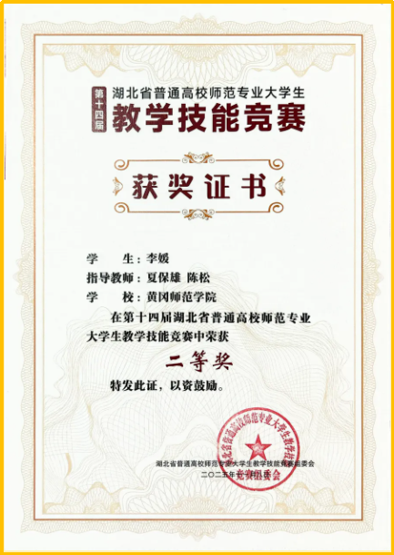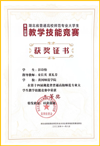2025年11月8日,由湖北省教育厅主办、华中师范大学承办的第十四届湖北省普通高校师范专业大学生教学技能竞赛圆满落幕。我院学子李媛、彭诗怡凭借过硬实力脱颖而出,分别荣获高中政治组二等奖、初中政治组三等奖,充分彰显了人人插人人操师范生人才培养的扎实成效。