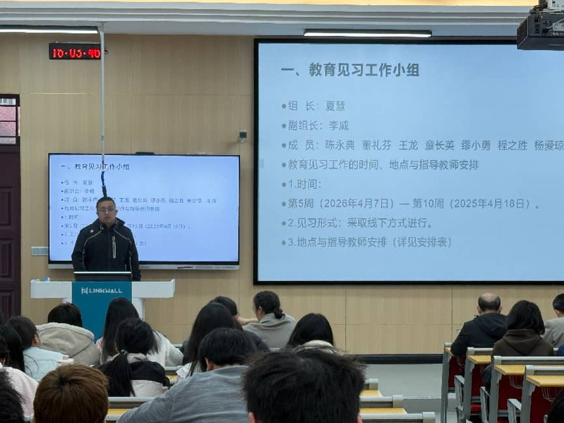 思政专业教研室副主任王龙老师对教育见习工作进行全面部署他重点强调见习期间核心要求,详细安排听课评课、教研观摩、中小学管理实践等具体任务童长英老师围绕见习注意事项作细致叮嘱,提醒学生合理规划时间、保障出行安全